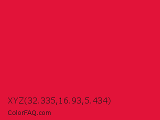 XYZ 32.335,16.93,5.434 Color is a normal red color and the nearest color is Crimson #dc143c. Hex code #e21339 and RGB value is rgb(226,19,57). In RGB color space, this color is composed of 89% red, 7% green, 22% blue, In CMYK color space, this color is composed of 0% cyan, 92% magenta, 75% yellow , 11% black , In HSL color space, this color has a hue angle of 349° , 84% saturation and 48% lightness.