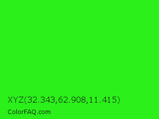 XYZ 32.343,62.908,11.415 Color is a normal green color and the nearest color is Neon Green #39ff14. Hex code #2bf01a and RGB value is rgb(43,240,26). In RGB color space, this color is composed of 17% red, 94% green, 10% blue, In CMYK color space, this color is composed of 82% cyan, 0% magenta, 89% yellow , 6% black , In HSL color space, this color has a hue angle of 115° , 88% saturation and 52% lightness.
