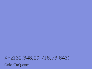 XYZ 32.348,29.718,73.843 Color is a light blue color and the nearest color is Chetwode Blue #8581d9. Hex code #828fdf and RGB value is rgb(130,143,223). In RGB color space, this color is composed of 51% red, 56% green, 87% blue, In CMYK color space, this color is composed of 42% cyan, 36% magenta, 0% yellow , 13% black , In HSL color space, this color has a hue angle of 232° , 59% saturation and 69% lightness.