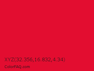 XYZ 32.356,16.832,4.34 Color is a normal red color and the nearest color is Medium Candy Apple Red #e2062c. Hex code #e30d30 and RGB value is rgb(227,13,48). In RGB color space, this color is composed of 89% red, 5% green, 19% blue, In CMYK color space, this color is composed of 0% cyan, 94% magenta, 79% yellow , 11% black , In HSL color space, this color has a hue angle of 350° , 89% saturation and 47% lightness.