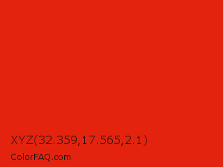 XYZ 32.359,17.565,2.1 Color is a normal red color and the nearest color is Lust #e62020. Hex code #e3230e and RGB value is rgb(227,35,14). In RGB color space, this color is composed of 89% red, 14% green, 5% blue, In CMYK color space, this color is composed of 0% cyan, 85% magenta, 94% yellow , 11% black , In HSL color space, this color has a hue angle of 6° , 88% saturation and 47% lightness.