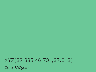 XYZ 32.385,46.701,37.013 Color is a normal green color and the nearest color is Silver Tree #66b58f. Hex code #6bc898 and RGB value is rgb(107,200,152). In RGB color space, this color is composed of 42% red, 78% green, 60% blue, In CMYK color space, this color is composed of 47% cyan, 0% magenta, 24% yellow , 22% black , In HSL color space, this color has a hue angle of 149° , 46% saturation and 60% lightness.