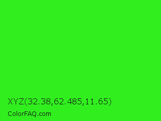 XYZ 32.38,62.485,11.65 Color is a normal green color and the nearest color is Neon Green #39ff14. Hex code #31ef1f and RGB value is rgb(49,239,31). In RGB color space, this color is composed of 19% red, 94% green, 12% blue, In CMYK color space, this color is composed of 79% cyan, 0% magenta, 87% yellow , 6% black , In HSL color space, this color has a hue angle of 115° , 87% saturation and 53% lightness.