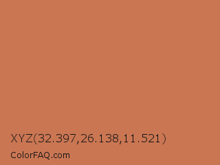 XYZ 32.397,26.138,11.521 Color is a normal orange color and the nearest color is Copper Red #cb6d51. Hex code #ca7653 and RGB value is rgb(202,118,83). In RGB color space, this color is composed of 79% red, 46% green, 33% blue, In CMYK color space, this color is composed of 0% cyan, 42% magenta, 59% yellow , 21% black , In HSL color space, this color has a hue angle of 18° , 53% saturation and 56% lightness.