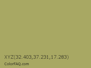 XYZ 32.403,37.231,17.283 Color is a normal yellow color and the nearest color is Green Smoke #a4af6e. Hex code #a8a863 and RGB value is rgb(168,168,99). In RGB color space, this color is composed of 66% red, 66% green, 39% blue, In CMYK color space, this color is composed of 0% cyan, 0% magenta, 41% yellow , 34% black , In HSL color space, this color has a hue angle of 60° , 28% saturation and 52% lightness.