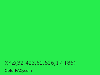 XYZ 32.423,61.516,17.186 Color is a normal green color and the nearest color is Malachite #0bda51. Hex code #26ed4d and RGB value is rgb(38,237,77). In RGB color space, this color is composed of 15% red, 93% green, 30% blue, In CMYK color space, this color is composed of 84% cyan, 0% magenta, 68% yellow , 7% black , In HSL color space, this color has a hue angle of 132° , 85% saturation and 54% lightness.