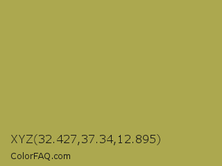 XYZ 32.427,37.34,12.895 Color is a normal yellow color and the nearest color is Husk #b7a458. Hex code #aca84f and RGB value is rgb(172,168,79). In RGB color space, this color is composed of 67% red, 66% green, 31% blue, In CMYK color space, this color is composed of 0% cyan, 2% magenta, 54% yellow , 33% black , In HSL color space, this color has a hue angle of 57° , 37% saturation and 49% lightness.