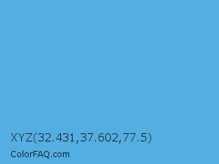 XYZ 32.431,37.602,77.5 Color is a light blue color and the nearest color is Blue Jeans #5dadec. Hex code #53aee2 and RGB value is rgb(83,174,226). In RGB color space, this color is composed of 33% red, 68% green, 89% blue, In CMYK color space, this color is composed of 63% cyan, 23% magenta, 0% yellow , 11% black , In HSL color space, this color has a hue angle of 202° , 71% saturation and 61% lightness.