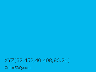 XYZ 32.452,40.408,86.21 Color is a normal blue color and the nearest color is Cyan Process #00b7eb. Hex code #02b8ed and RGB value is rgb(2,184,237). In RGB color space, this color is composed of 1% red, 72% green, 93% blue, In CMYK color space, this color is composed of 99% cyan, 22% magenta, 0% yellow , 7% black , In HSL color space, this color has a hue angle of 194° , 98% saturation and 47% lightness.