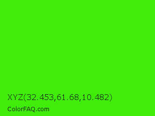XYZ 32.453,61.68,10.482 Color is a normal green color and the nearest color is Harlequin #3fff00. Hex code #40ed0a and RGB value is rgb(64,237,10). In RGB color space, this color is composed of 25% red, 93% green, 4% blue, In CMYK color space, this color is composed of 73% cyan, 0% magenta, 96% yellow , 7% black , In HSL color space, this color has a hue angle of 106° , 92% saturation and 48% lightness.