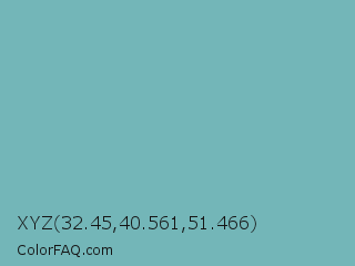 XYZ 32.45,40.561,51.466 Color is a normal cyan color and the nearest color is Neptune #7cb7bb. Hex code #73b6b8 and RGB value is rgb(115,182,184). In RGB color space, this color is composed of 45% red, 71% green, 72% blue, In CMYK color space, this color is composed of 38% cyan, 1% magenta, 0% yellow , 28% black , In HSL color space, this color has a hue angle of 182° , 33% saturation and 59% lightness.