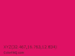 XYZ 32.467,16.763,12.834 Color is a normal rose color and the nearest color is Ruby #e0115f. Hex code #de1061 and RGB value is rgb(222,16,97). In RGB color space, this color is composed of 87% red, 6% green, 38% blue, In CMYK color space, this color is composed of 0% cyan, 93% magenta, 56% yellow , 13% black , In HSL color space, this color has a hue angle of 336° , 87% saturation and 47% lightness.