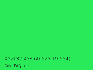 XYZ 32.468,60.626,19.664 Color is a normal green color and the nearest color is Malachite #0bda51. Hex code #29eb5a and RGB value is rgb(41,235,90). In RGB color space, this color is composed of 16% red, 92% green, 35% blue, In CMYK color space, this color is composed of 83% cyan, 0% magenta, 62% yellow , 8% black , In HSL color space, this color has a hue angle of 135° , 83% saturation and 54% lightness.