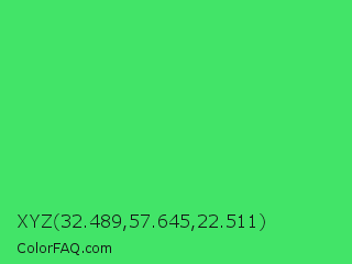 XYZ 32.489,57.645,22.511 Color is a normal green color and the nearest color is UFO Green #3cd070. Hex code #42e468 and RGB value is rgb(66,228,104). In RGB color space, this color is composed of 26% red, 89% green, 41% blue, In CMYK color space, this color is composed of 71% cyan, 0% magenta, 54% yellow , 11% black , In HSL color space, this color has a hue angle of 134° , 75% saturation and 58% lightness.