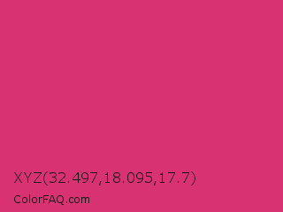 XYZ 32.497,18.095,17.7 Color is a normal rose color and the nearest color is Telemagenta #cf3476. Hex code #d83272 and RGB value is rgb(216,50,114). In RGB color space, this color is composed of 85% red, 20% green, 45% blue, In CMYK color space, this color is composed of 0% cyan, 77% magenta, 47% yellow , 15% black , In HSL color space, this color has a hue angle of 337° , 68% saturation and 52% lightness.