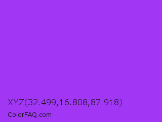 XYZ 32.499,16.808,87.918 Color is a normal purple color and the nearest color is Veronica #a020f0. Hex code #a136f5 and RGB value is rgb(161,54,245). In RGB color space, this color is composed of 63% red, 21% green, 96% blue, In CMYK color space, this color is composed of 34% cyan, 78% magenta, 0% yellow , 4% black , In HSL color space, this color has a hue angle of 274° , 91% saturation and 59% lightness.