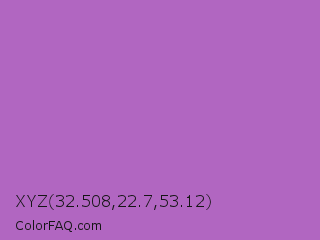 XYZ 32.508,22.7,53.12 Color is a normal purple color and the nearest color is Rich Lilac #b666d2. Hex code #b166c1 and RGB value is rgb(177,102,193). In RGB color space, this color is composed of 69% red, 40% green, 76% blue, In CMYK color space, this color is composed of 8% cyan, 47% magenta, 0% yellow , 24% black , In HSL color space, this color has a hue angle of 289° , 42% saturation and 58% lightness.