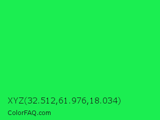 XYZ 32.512,61.976,18.034 Color is a normal green color and the nearest color is Malachite #0bda51. Hex code #1bee51 and RGB value is rgb(27,238,81). In RGB color space, this color is composed of 11% red, 93% green, 32% blue, In CMYK color space, this color is composed of 89% cyan, 0% magenta, 66% yellow , 7% black , In HSL color space, this color has a hue angle of 135° , 86% saturation and 52% lightness.