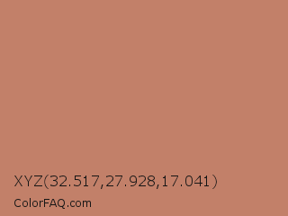 XYZ 32.517,27.928,17.041 Color is a normal orange color and the nearest color is Antique Brass #c88a65. Hex code #c28069 and RGB value is rgb(194,128,105). In RGB color space, this color is composed of 76% red, 50% green, 41% blue, In CMYK color space, this color is composed of 0% cyan, 34% magenta, 46% yellow , 24% black , In HSL color space, this color has a hue angle of 16° , 42% saturation and 59% lightness.