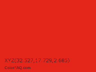 XYZ 32.527,17.729,2.685 Color is a normal red color and the nearest color is Lust #e62020. Hex code #e3251a and RGB value is rgb(227,37,26). In RGB color space, this color is composed of 89% red, 15% green, 10% blue, In CMYK color space, this color is composed of 0% cyan, 84% magenta, 89% yellow , 11% black , In HSL color space, this color has a hue angle of 3° , 79% saturation and 50% lightness.