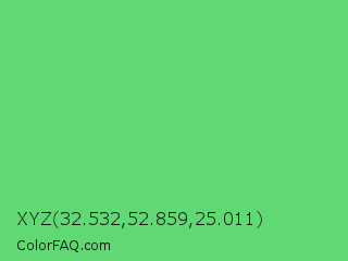 XYZ 32.532,52.859,25.011 Color is a light green color and the nearest color is Emerald #50c878. Hex code #60d874 and RGB value is rgb(96,216,116). In RGB color space, this color is composed of 38% red, 85% green, 45% blue, In CMYK color space, this color is composed of 56% cyan, 0% magenta, 46% yellow , 15% black , In HSL color space, this color has a hue angle of 130° , 61% saturation and 61% lightness.