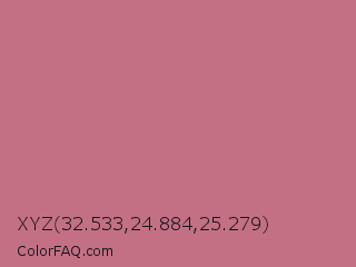 XYZ 32.533,24.884,25.279 Color is a normal red color and the nearest color is Turkish Rose #b57281. Hex code #c37085 and RGB value is rgb(195,112,133). In RGB color space, this color is composed of 76% red, 44% green, 52% blue, In CMYK color space, this color is composed of 0% cyan, 43% magenta, 32% yellow , 24% black , In HSL color space, this color has a hue angle of 345° , 41% saturation and 60% lightness.