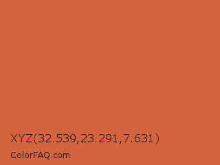 XYZ 32.539,23.291,7.631 Color is a normal red color and the nearest color is Medium Vermilion #d9603b. Hex code #d46340 and RGB value is rgb(212,99,64). In RGB color space, this color is composed of 83% red, 39% green, 25% blue, In CMYK color space, this color is composed of 0% cyan, 53% magenta, 70% yellow , 17% black , In HSL color space, this color has a hue angle of 14° , 63% saturation and 54% lightness.