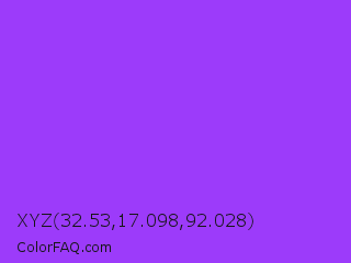 XYZ 32.53,17.098,92.028 Color is a light violet color and the nearest color is Veronica #a020f0. Hex code #9c3bfa and RGB value is rgb(156,59,250). In RGB color space, this color is composed of 61% red, 23% green, 98% blue, In CMYK color space, this color is composed of 38% cyan, 76% magenta, 0% yellow , 2% black , In HSL color space, this color has a hue angle of 270° , 95% saturation and 61% lightness.
