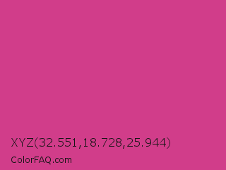 XYZ 32.551,18.728,25.944 Color is a normal rose color and the nearest color is Smitten #c84186. Hex code #d13d8a and RGB value is rgb(209,61,138). In RGB color space, this color is composed of 82% red, 24% green, 54% blue, In CMYK color space, this color is composed of 0% cyan, 71% magenta, 34% yellow , 18% black , In HSL color space, this color has a hue angle of 329° , 62% saturation and 53% lightness.