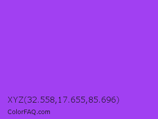 XYZ 32.558,17.655,85.696 Color is a normal purple color and the nearest color is Navy Purple #9457eb. Hex code #a140f2 and RGB value is rgb(161,64,242). In RGB color space, this color is composed of 63% red, 25% green, 95% blue, In CMYK color space, this color is composed of 33% cyan, 74% magenta, 0% yellow , 5% black , In HSL color space, this color has a hue angle of 273° , 87% saturation and 60% lightness.