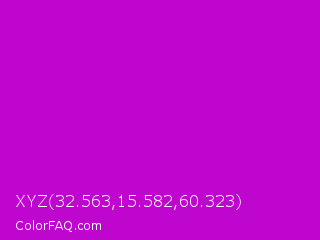 XYZ 32.563,15.582,60.323 Color is a normal magenta color and the nearest color is Deep Magenta #cc00cc. Hex code #be06cf and RGB value is rgb(190,6,207). In RGB color space, this color is composed of 75% red, 2% green, 81% blue, In CMYK color space, this color is composed of 8% cyan, 97% magenta, 0% yellow , 19% black , In HSL color space, this color has a hue angle of 295° , 94% saturation and 42% lightness.