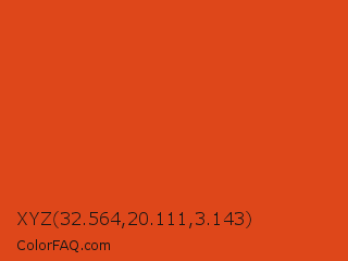 XYZ 32.564,20.111,3.143 Color is a normal red color and the nearest color is Vermilion #d9381e. Hex code #de471a and RGB value is rgb(222,71,26). In RGB color space, this color is composed of 87% red, 28% green, 10% blue, In CMYK color space, this color is composed of 0% cyan, 68% magenta, 88% yellow , 13% black , In HSL color space, this color has a hue angle of 14° , 79% saturation and 49% lightness.