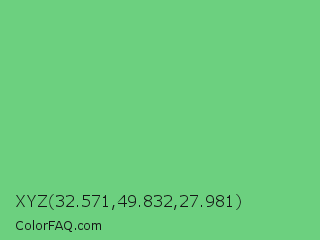 XYZ 32.571,49.832,27.981 Color is a light green color and the nearest color is Pastel Green #77dd77. Hex code #6cd07f and RGB value is rgb(108,208,127). In RGB color space, this color is composed of 42% red, 82% green, 50% blue, In CMYK color space, this color is composed of 48% cyan, 0% magenta, 39% yellow , 18% black , In HSL color space, this color has a hue angle of 131° , 52% saturation and 62% lightness.