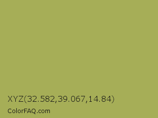 XYZ 32.582,39.067,14.84 Color is a normal yellow color and the nearest color is Olive Green #b5b35c. Hex code #a6ae57 and RGB value is rgb(166,174,87). In RGB color space, this color is composed of 65% red, 68% green, 34% blue, In CMYK color space, this color is composed of 5% cyan, 0% magenta, 50% yellow , 32% black , In HSL color space, this color has a hue angle of 66° , 35% saturation and 51% lightness.