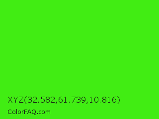 XYZ 32.582,61.739,10.816 Color is a normal green color and the nearest color is Neon Green #39ff14. Hex code #41ed13 and RGB value is rgb(65,237,19). In RGB color space, this color is composed of 25% red, 93% green, 7% blue, In CMYK color space, this color is composed of 73% cyan, 0% magenta, 92% yellow , 7% black , In HSL color space, this color has a hue angle of 107° , 86% saturation and 50% lightness.