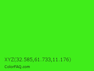XYZ 32.585,61.733,11.176 Color is a normal green color and the nearest color is Neon Green #39ff14. Hex code #40ed1a and RGB value is rgb(64,237,26). In RGB color space, this color is composed of 25% red, 93% green, 10% blue, In CMYK color space, this color is composed of 73% cyan, 0% magenta, 89% yellow , 7% black , In HSL color space, this color has a hue angle of 109° , 85% saturation and 52% lightness.