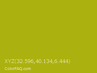 XYZ 32.596,40.134,6.444 Color is a normal yellow color and the nearest color is La Rioja #b3c110. Hex code #abb10e and RGB value is rgb(171,177,14). In RGB color space, this color is composed of 67% red, 69% green, 5% blue, In CMYK color space, this color is composed of 3% cyan, 0% magenta, 92% yellow , 31% black , In HSL color space, this color has a hue angle of 62° , 85% saturation and 37% lightness.