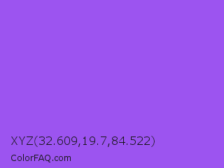 XYZ 32.609,19.7,84.522 Color is a light violet color and the nearest color is Navy Purple #9457eb. Hex code #9c54f0 and RGB value is rgb(156,84,240). In RGB color space, this color is composed of 61% red, 33% green, 94% blue, In CMYK color space, this color is composed of 35% cyan, 65% magenta, 0% yellow , 6% black , In HSL color space, this color has a hue angle of 268° , 84% saturation and 64% lightness.