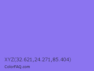 XYZ 32.621,24.271,85.404 Color is a light indigo color and the nearest color is Medium Slate Blue #7b68ee. Hex code #8b74f0 and RGB value is rgb(139,116,240). In RGB color space, this color is composed of 55% red, 45% green, 94% blue, In CMYK color space, this color is composed of 42% cyan, 52% magenta, 0% yellow , 6% black , In HSL color space, this color has a hue angle of 251° , 81% saturation and 70% lightness.