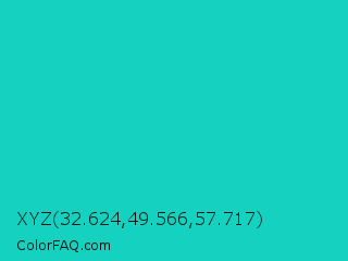 XYZ 32.624,49.566,57.717 Color is a normal cyan color and the nearest color is Java #1fc2c2. Hex code #15d1c0 and RGB value is rgb(21,209,192). In RGB color space, this color is composed of 8% red, 82% green, 75% blue, In CMYK color space, this color is composed of 90% cyan, 0% magenta, 8% yellow , 18% black , In HSL color space, this color has a hue angle of 175° , 82% saturation and 45% lightness.