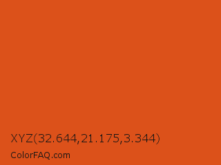 XYZ 32.644,21.175,3.344 Color is a normal orange color and the nearest color is Flame #e25822. Hex code #dc511a and RGB value is rgb(220,81,26). In RGB color space, this color is composed of 86% red, 32% green, 10% blue, In CMYK color space, this color is composed of 0% cyan, 63% magenta, 88% yellow , 14% black , In HSL color space, this color has a hue angle of 17° , 79% saturation and 48% lightness.