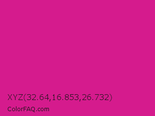 XYZ 32.64,16.853,26.732 Color is a normal magenta color and the nearest color is Barbie Pink #e0218a. Hex code #d51b8d and RGB value is rgb(213,27,141). In RGB color space, this color is composed of 84% red, 11% green, 55% blue, In CMYK color space, this color is composed of 0% cyan, 87% magenta, 34% yellow , 16% black , In HSL color space, this color has a hue angle of 323° , 78% saturation and 47% lightness.