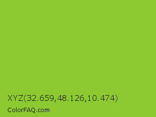 XYZ 32.659,48.126,10.474 Color is a normal green color and the nearest color is Atlantis #97cd2d. Hex code #8dca31 and RGB value is rgb(141,202,49). In RGB color space, this color is composed of 55% red, 79% green, 19% blue, In CMYK color space, this color is composed of 30% cyan, 0% magenta, 76% yellow , 21% black , In HSL color space, this color has a hue angle of 84° , 61% saturation and 49% lightness.