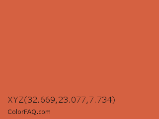 XYZ 32.669,23.077,7.734 Color is a normal red color and the nearest color is Medium Vermilion #d9603b. Hex code #d56141 and RGB value is rgb(213,97,65). In RGB color space, this color is composed of 84% red, 38% green, 25% blue, In CMYK color space, this color is composed of 0% cyan, 54% magenta, 69% yellow , 16% black , In HSL color space, this color has a hue angle of 13° , 64% saturation and 55% lightness.