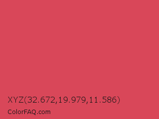XYZ 32.672,19.979,11.586 Color is a normal red color and the nearest color is Dark Terra Cotta #cc4e5c. Hex code #d94759 and RGB value is rgb(217,71,89). In RGB color space, this color is composed of 85% red, 28% green, 35% blue, In CMYK color space, this color is composed of 0% cyan, 67% magenta, 59% yellow , 15% black , In HSL color space, this color has a hue angle of 353° , 66% saturation and 56% lightness.