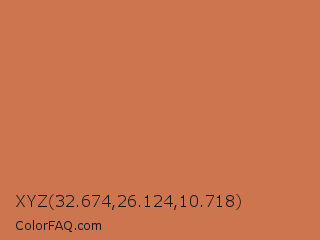XYZ 32.674,26.124,10.718 Color is a normal orange color and the nearest color is Copper Red #cb6d51. Hex code #cc754f and RGB value is rgb(204,117,79). In RGB color space, this color is composed of 80% red, 46% green, 31% blue, In CMYK color space, this color is composed of 0% cyan, 43% magenta, 61% yellow , 20% black , In HSL color space, this color has a hue angle of 18° , 55% saturation and 55% lightness.