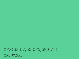 XYZ 32.67,50.025,38.071 Color is a normal green color and the nearest color is Medium Aquamarine #66ddaa. Hex code #59d199 and RGB value is rgb(89,209,153). In RGB color space, this color is composed of 35% red, 82% green, 60% blue, In CMYK color space, this color is composed of 57% cyan, 0% magenta, 27% yellow , 18% black , In HSL color space, this color has a hue angle of 152° , 57% saturation and 58% lightness.