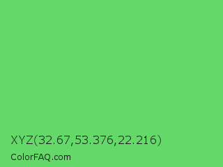 XYZ 32.67,53.376,22.216 Color is a light green color and the nearest color is Pastel Green #77dd77. Hex code #64d96a and RGB value is rgb(100,217,106). In RGB color space, this color is composed of 39% red, 85% green, 42% blue, In CMYK color space, this color is composed of 54% cyan, 0% magenta, 51% yellow , 15% black , In HSL color space, this color has a hue angle of 123° , 61% saturation and 62% lightness.