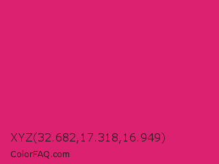 XYZ 32.682,17.318,16.949 Color is a normal rose color and the nearest color is Razzmatazz #e3256b. Hex code #db2170 and RGB value is rgb(219,33,112). In RGB color space, this color is composed of 86% red, 13% green, 44% blue, In CMYK color space, this color is composed of 0% cyan, 85% magenta, 49% yellow , 14% black , In HSL color space, this color has a hue angle of 335° , 74% saturation and 49% lightness.