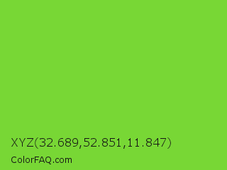 XYZ 32.689,52.851,11.847 Color is a normal green color and the nearest color is Kiwi #8ee53f. Hex code #78d735 and RGB value is rgb(120,215,53). In RGB color space, this color is composed of 47% red, 84% green, 21% blue, In CMYK color space, this color is composed of 44% cyan, 0% magenta, 75% yellow , 16% black , In HSL color space, this color has a hue angle of 95° , 67% saturation and 53% lightness.